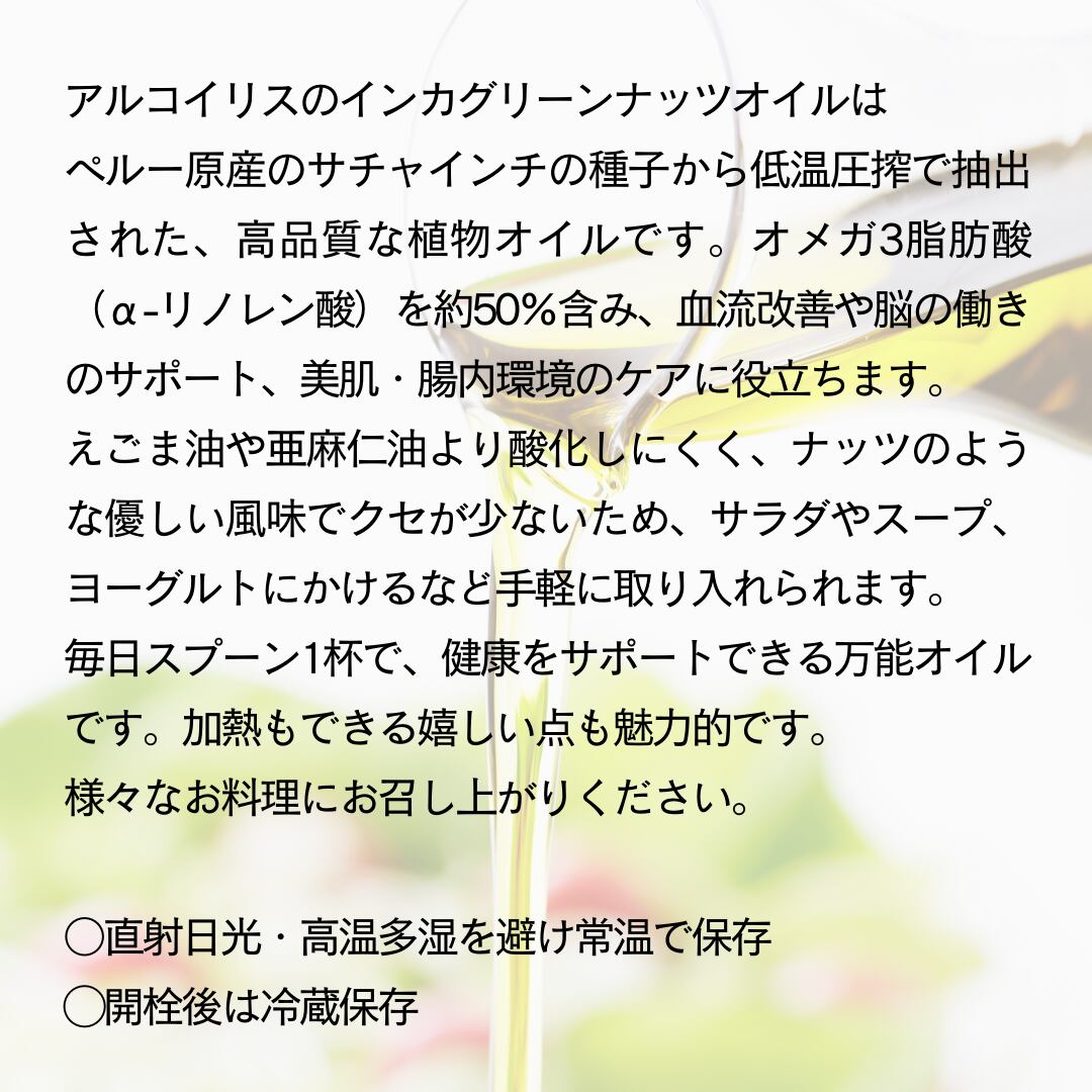 インカグリーンナッツオイルは加熱可の大変希少なオメガ3系オイルなので生でも炒め物にもお使いいただけます。成分の効果を期待して摂取する場合は、毎日スプーン一杯を目安にお召し上がりください。